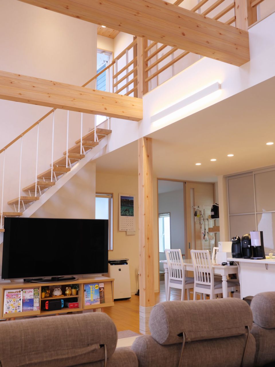 大きな吹抜けのあるリビングで木の下大工ボードのカットを行っています。