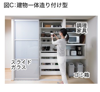 主婦とすれば(図C)のように、最初から標準で、食器棚と家電を置く棚がついているのが嬉しいですよね。一般の会社はオプションが多いです。 | ![]() |